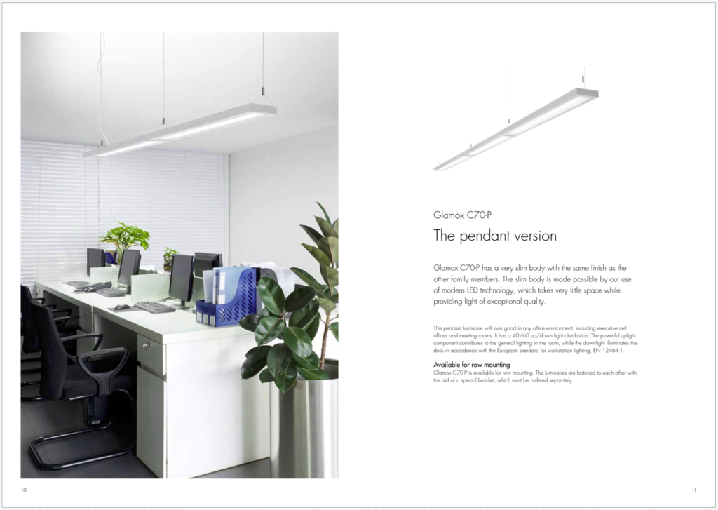 Denna gången var det lite ont om tid, och miljöbilderna fick därför konstrueras digitalt. Kontorsbilderna kommer från ”stock-arkiv”, och det blir lite jobb att hitta lämpligt material. Sedan är det en hel del pill med att montera in armaturerna så att perspektiv och ljusbilder ser naturliga ut.